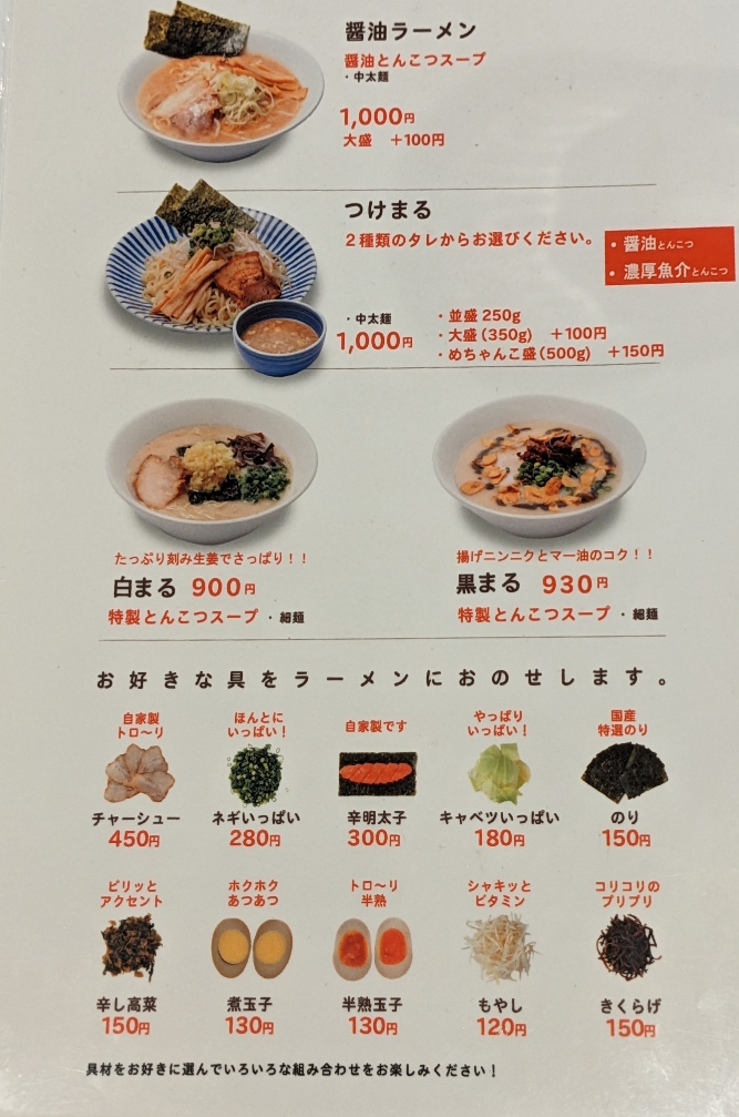 醤油ラーメン 1,000円 つけまる 1,000円 白まる 900円 黒まる 930円