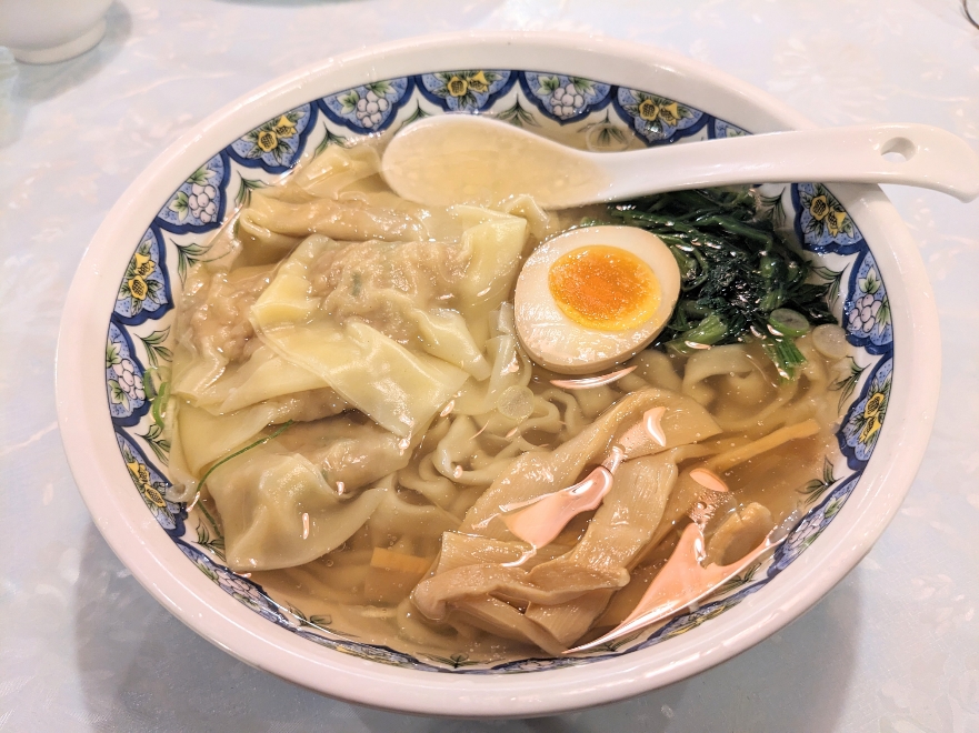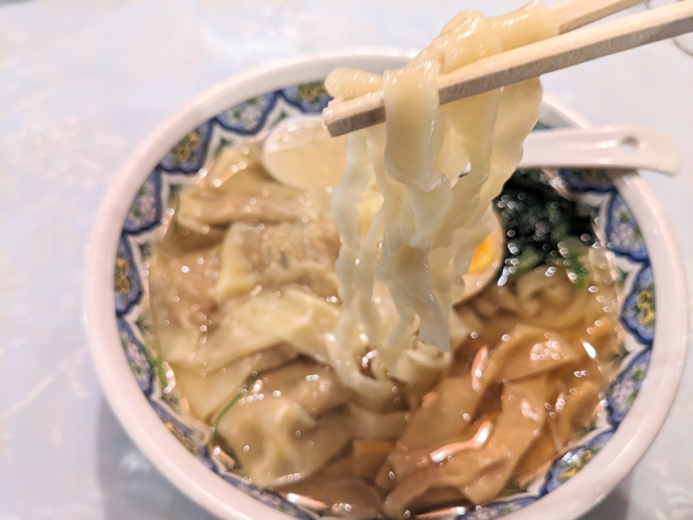 塩味のワンタン麺です。ワンタンはお肉が詰まったワンタンです。スープはあっさりとした塩味です。