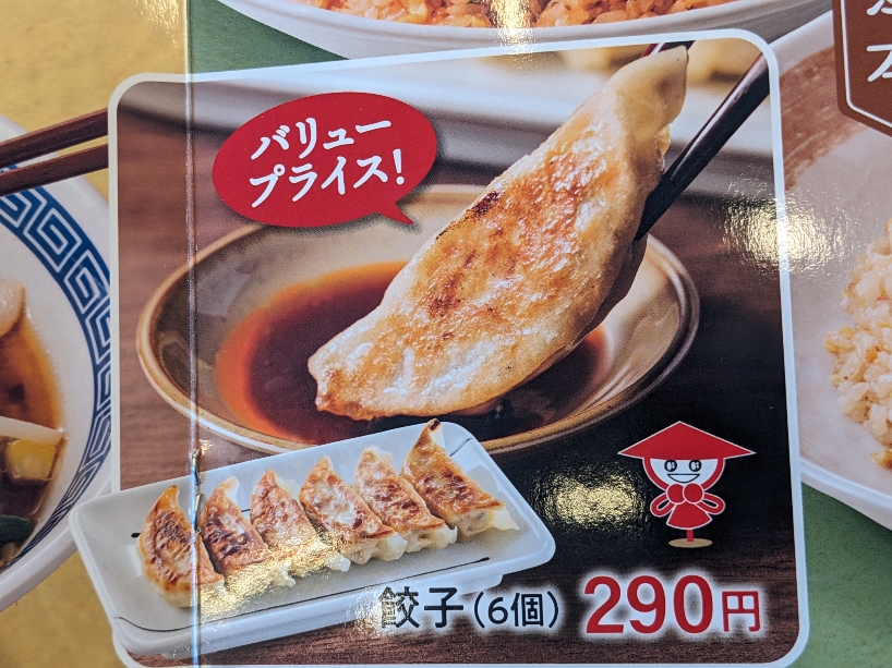 メニューです。餃子(6個)290円。 お値打ち価格。