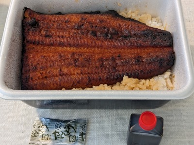 うな重(梅)です。テイクアウトでうな重が楽しめます。タレと山椒が付いてきます。やはり温かいうちが美味しいので、冷めないうちがオススメです。
