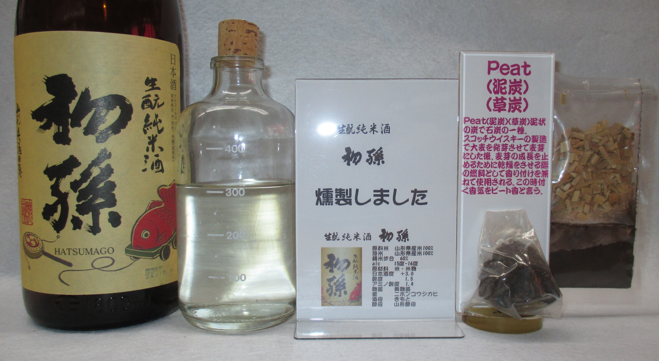 日本酒二種類燻製しました。 賛否両論です。 試飲してください。愉しいお酒です。