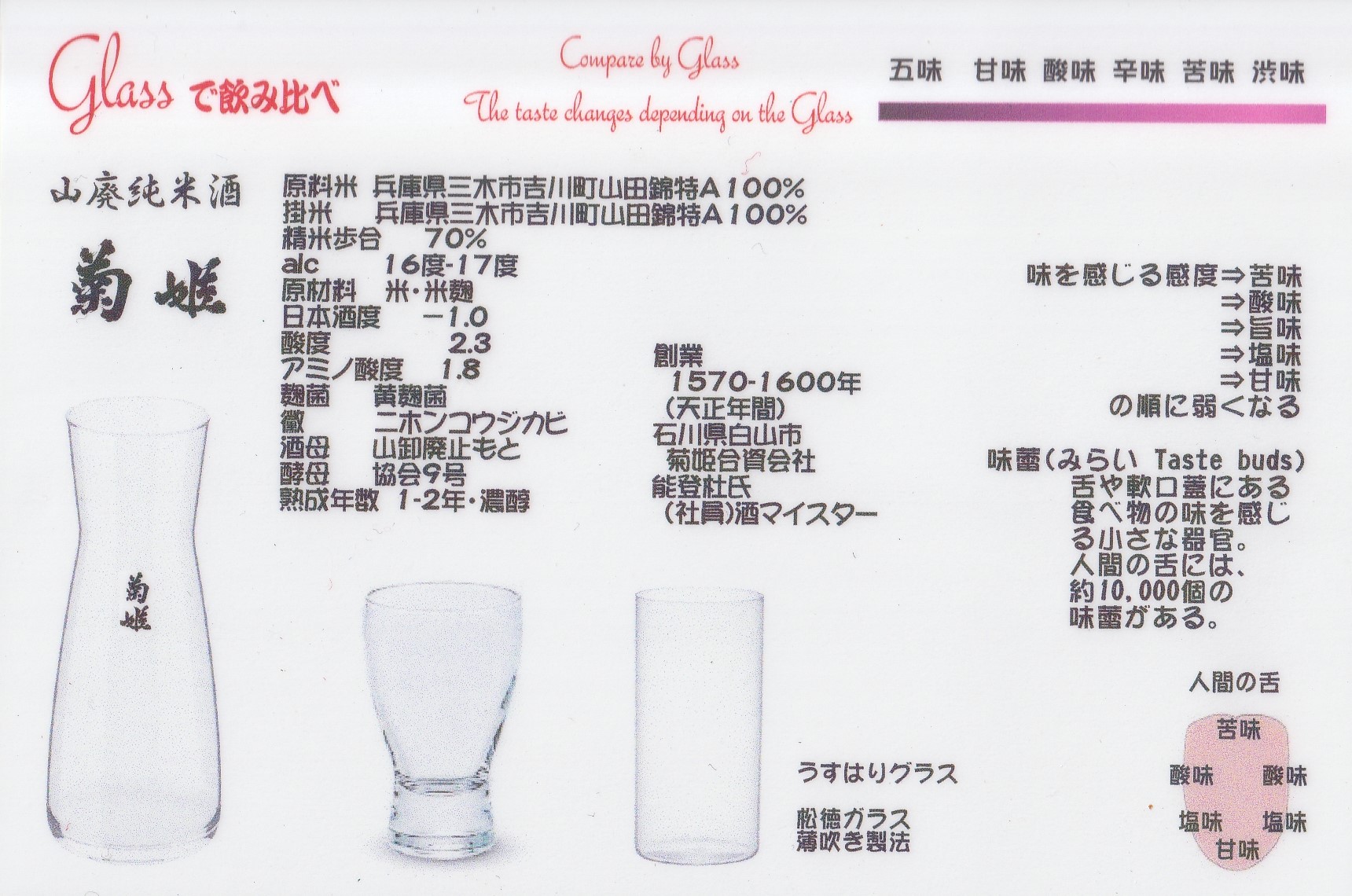 Glassで飲み比べです。山廃純米酒菊姫を、 Glassで飲み比べします。普通のグラスと うすはりグラスで飲み比べ。お酒の味、香りが 際立って違うのがわかります。