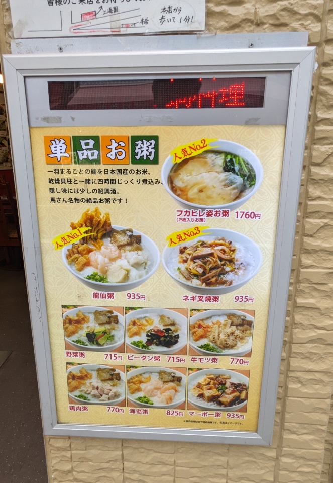 店頭にあるお粥の案内看板です。 単品お粥 ●フカヒレ姿お粥 1760円 ●龍仙粥 935円 ●ネギ叉焼粥 935円 ●野菜粥 715円 ●ピータン粥 715円 ●牛モツ粥 770円 ●雞肉粥 770円 ●海老粥 825円 ●マーボー粥 935円