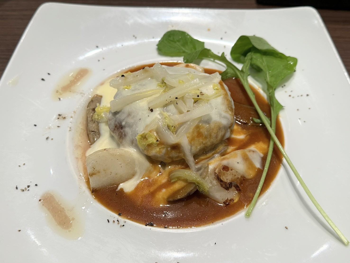 チーズソースに包まれたハンバーグです。トリュフとイセエビの特製ソースで仕上げられています。