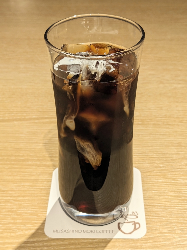 「'むさしの森珈琲オーガニックスペシャル'アイス珈琲」です。¥550。適度な苦みが美味しい本格的なコーヒーです。