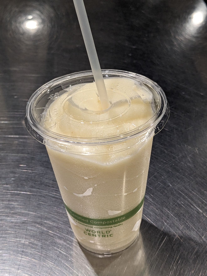 爽やかなイチゴのテイストのスムージー。冷たくて美味しいです。